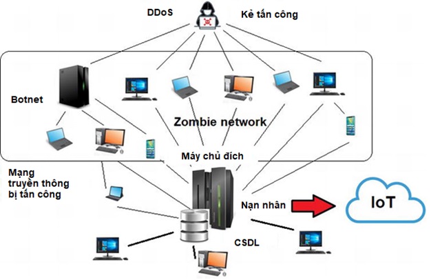 Hình 2. Sơ đồ tấn công DDoS trên hệ thống Internet vạn vật, sử dụng botnet để tấn công máy chủ quản lý thông tin của thiết bị Internet vạn vật, từ đó đến tiếp cận và kiểm soát cơ sở dữ liệu và mạng kết nối [5].