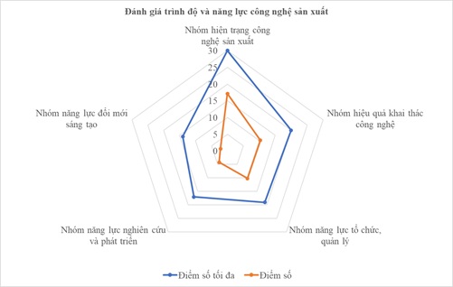 Thực hiện nhiệm vụ nêu trên, nhóm nghiên cứu đã đánh giá trình độ và năng lực công nghệ sản xuất dựa vào phương pháp định lượng theo thang điểm chung (100 điểm cho tổng số 26 tiêu chí) để đưa về cùng một mặt bằng đánh giá. Trong đó: nhóm T (hiện trạng công nghệ, thiết bị sản xuất) tối đa 30 điểm cho 7 tiêu chí; nhóm E (hiệu quả khai thác công nghệ) tối đa 20 điểm cho 5 tiêu chí; nhóm O (năng lực tổ chức, quản lý) tối đa 19 điểm cho 5 tiêu chí; nhóm R (năng lực nghiên cứu phát triển) tối đa 17 điểm cho 5 tiêu chí; nhóm I (năng lực đổi mới sáng tạo) tối đa 14 điểm cho 4 tiêu chí (Phương pháp đánh giá được thực hiện theo hướng dẫn của Thông tư số 17/2019/TT-BKHCN, ngày 10/12/2019, của Bộ trưởng Bộ Khoa học và Công nghệ hướng dẫn đánh giá trình độ và năng lực công nghệ sản xuất.