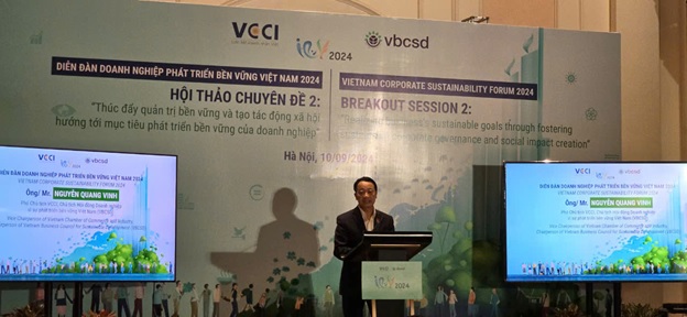 Ông Nguyễn Quang Vinh - Phó Chủ tịch Liên đoàn Thương mại và Công nghiệp Việt Nam, Chủ tịch Hội đồng Doanh nghiệp vì sự phát triển bền vững Việt Nam cho biết, trên hành trình hướng tới Net Zero vào năm 2050 cũng như xây dựng một tương lai bền vững cho nhân loại, vai trò của cộng đồng doanh nghiệp phát triển bền vững đã được khẳng định là đặc biệt quan trọng. Ngược lại, thúc đẩy phát triển bền vững, doanh nghiệp sẽ đảm bảo được giấy phép kinh doanh, kế hoạch kinh doanh liên tục, nâng cao uy tín thương hiệu, từ đó đảm bảo tăng trưởng dài hạn cho chính doanh nghiệp.