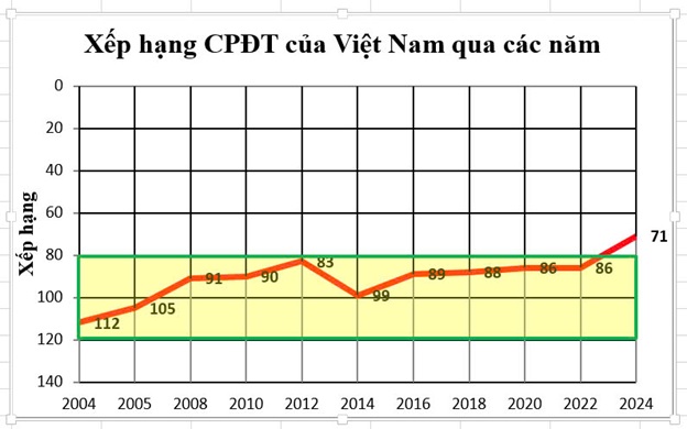 Biểu đồ xếp hạng chính phủ điện tử của Việt Nam trong giai đoạn 2004-2024.