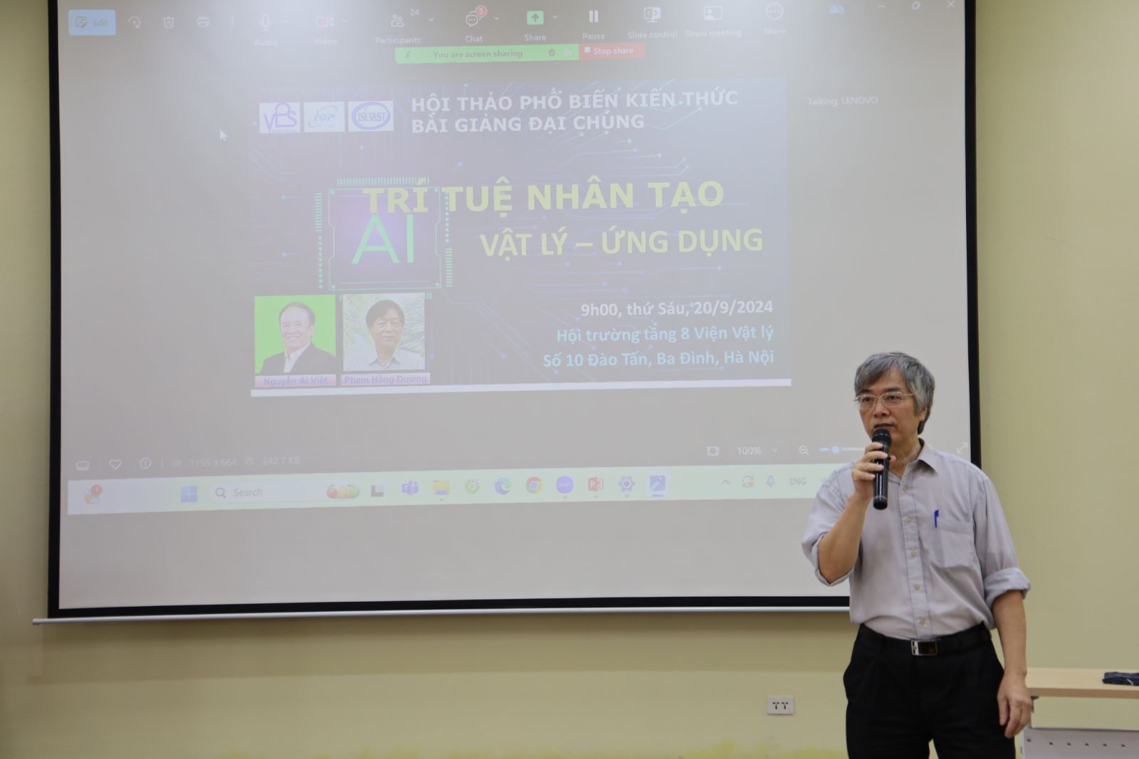 Với chủ đề mang tính thời sự và có tầm ảnh hưởng sâu rộng, bài giảng đại chúng "Trí tuệ nhân tạo, Vật lý - Ứng dụng" không chỉ cung cấp kiến thức chuyên sâu mà còn mở ra những hướng đi mới, kết hợp trí tuệ nhân tạo và vật lý để thúc đẩy sự phát triển của khoa học và công nghệ. Diễn giả của Hội thảo là PGS.TS Nguyễn Ái Việt (Đại học Quốc gia Hà Nội) và PGS.TS Phạm Hồng Dương (Viện Khoa học Vật liệu).