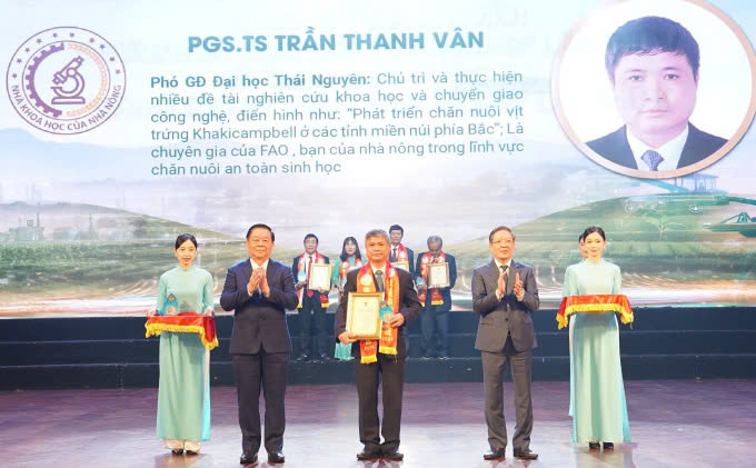 Trưởng Ban Tuyên giáo Trung ương Nguyễn Trọng Nghĩa (trái) và Chủ tịch Ban Chấp hành Trung ương Hội Nông dân Việt Nam Lương Quốc Đoàn (phải) trao Giấy chứng nhận và biểu trưng cho PGS.TS Trần Thanh Vân.