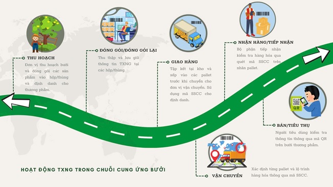 Ngoài ra, Trung tâm Mã số, Mã vạch Quốc gia đã xây dựng và áp dụng 05 quy trình TXNG cho 05 loại sản phẩm chủ lực của tỉnh Bình Dương. Hình 2 thể hiện việc áp dụng TXNG đối với chuỗi cung ứng sản phẩm bưởi.