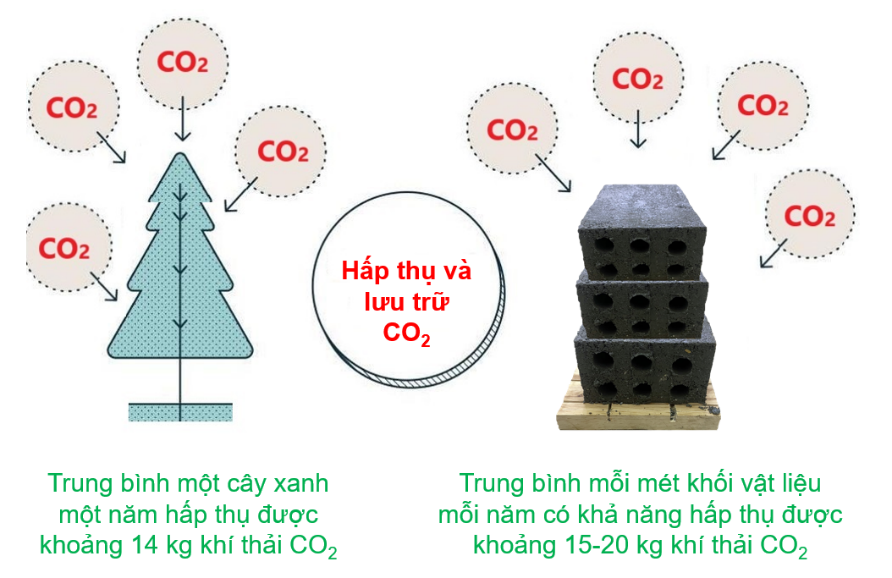 Trong nghiên cứu này, khí CO2 được dẫn vào trong từ bình chứa qua các đường ống để dẫn vào trong cấu trúc của sản phẩm. Theo TS Tăng Văn Lâm ( Trường Đại học Mỏ - Địa chất), đây là kết quả nghiên cứu quan trọng đầu tiên về vật liệu xây dựng từ phế thải với khả năng hấp thụ khí CO2 ở Việt Nam hiện nay. Từ thành phần cấp phối vật liệu khi thí nghiệm cho thấy, trong mỗi mét khối mẫu bê tông đã tái sử dụng khoảng 1,5-1,8 tấn các loại phế thải công nghiệp (tro bay nhiệt điện, tro bay điện rác, xỉ luyện kim, bột gốm sứ, bùn thải khai thác khoáng sản, hạt kính phế thải, hạt xỉ than tổ ong sau khi sử dụng…) và không sử dụng các nguồn vật liệu tự nhiên (cát sông, đá vôi, đất sét…). Kết quả của nghiên cứu sẽ góp phần thúc đẩy nền kinh tế xanh tuần hoàn bền vững, giảm thâm hụt nguồn tài nguyên thiên nhiên và giảm thiểu nguy cơ ô nhiễm môi trường từ các nguồn khí thải nhà kính.
