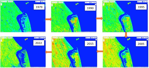 Diễn biến cửa sông Cửa Hội giai đoạn 1979-2022 qua ảnh vệ tinh.