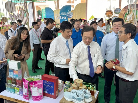 Bộ trưởng Bộ Khoa học và Công nghệ Huỳnh Thành Đạt và Chủ tịch UBND tỉnh Đồng Tháp Phạm Thiện Nghĩa tham quan gian hàng của Sở Khoa học và Công nghệ TP Cần Thơ trong khuôn khổ Diễn đàn Khởi nghiệp Đồng bằng sông Cửu Long lần II năm 2024.