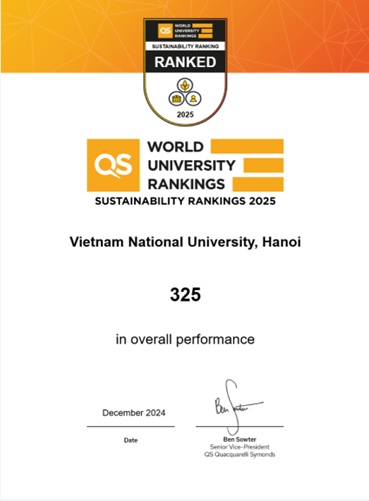 Ngày 10/12/2024, tổ chức xếp hạng QS đã công bố kết quả xếp hạng QS World University Rankings: Sustainability 2025 cho 1.751 cơ sở giáo dục đại học trên toàn thế giới. Trong kỳ xếp hạng lần này, Đại học Quốc gia Hà Nội (ĐHQGHN) đã có sự thăng tiến mạnh về vị trí khi được xếp hạng 325 thế giới (tăng 456 bậc so với vị trí xếp hạng trong top 781-790 tại kỳ xếp hạng QS World University Rankings: Sustainability 2024), vị trí 51 của khu vực châu Á và số 1 Việt Nam.