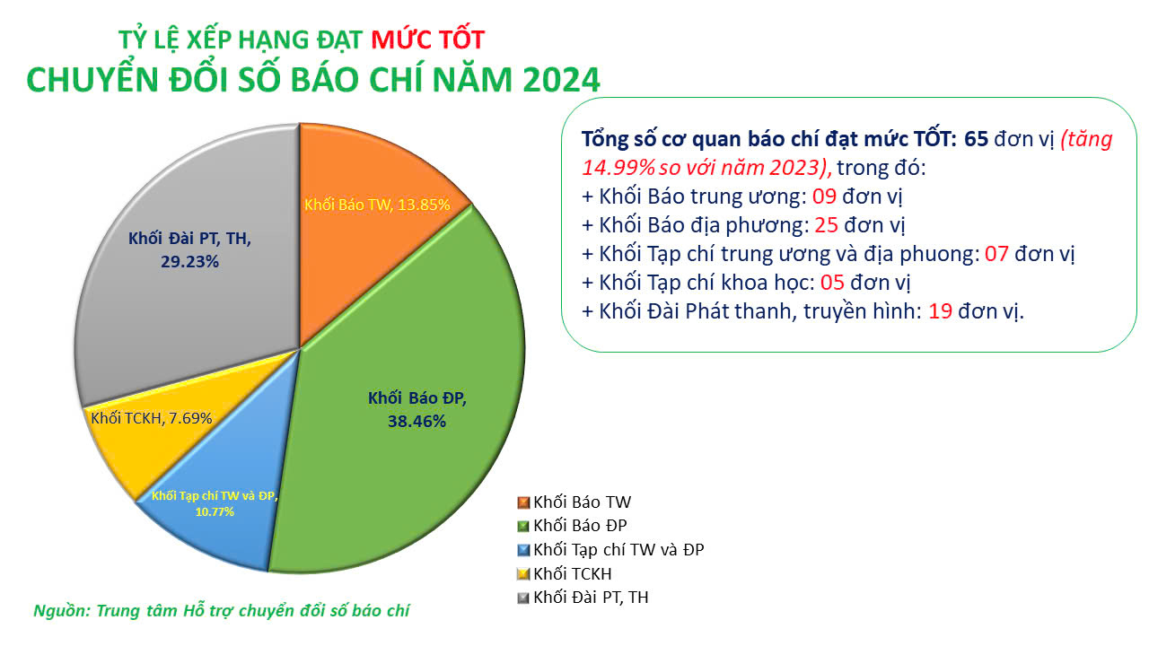 Kết quả đánh giá mức độ trưởng thành chuyển đổi số báo chí năm 2024 cho thấy: Tổng số cơ quan báo chí đạt mức Xuất sắc là 28 đơn vị (tăng 6,27% so với năm 2023), trong đó: Khối Báo trung ương: 10 đơn vị; Khối Báo địa phương: 08 đơn vị; Khối Đài Phát thanh, truyền hình: 10 đơn vị.