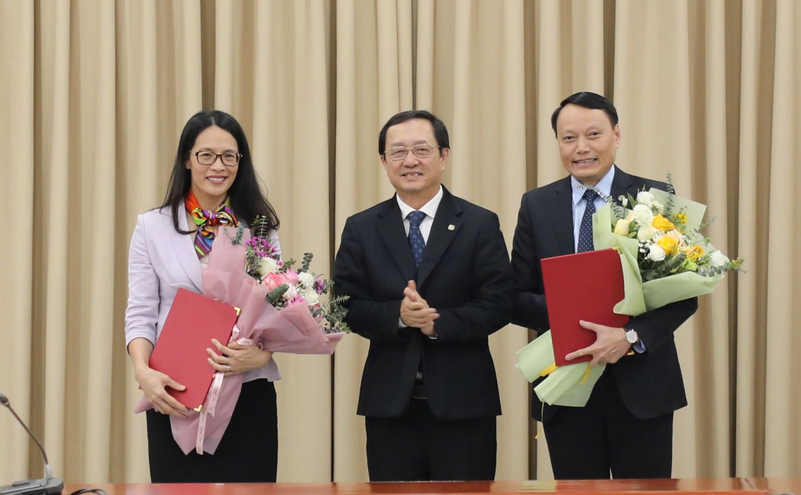 Bộ trưởng Bộ Khoa học và Công nghệ Huỳnh Thành Đạt (giữa) trao quyết định cho đồng chí Nguyễn Thị Huệ (trái) và đồng chí Trần Hậu Ngọc (phải).