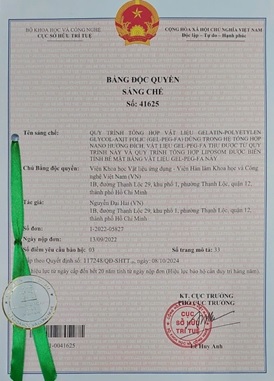 Các nhà khoa học cũng nghiên cứu thành công 01 quy trình tổng hợp hệ liposome gắn tác nhân hướng đích và 01 quy trình nang hóa thuốc vào hệ liposome. Ngoài ra, đề tài có được 01 bằng giải sáng chế số 41625 “Quy trình tổng hợp vật liệu gelatin- polyethylen glycol-axit folic (Gel-PEG-FA) dùng trong tổng hợp nano hướng đích, vật liệu (Gel-PEG-FA) thu được từ quy trình này và quy trình tổng hợp liposom được biến tính bề mặt bằng vật liệu Gel-PEG-FA này”; đào tạo 02 học viên cao học làm luận văn thạc sỹ; công bố 02 bài báo trên tạp chí Journal of Applied Polymer Science và ACS Applied Bio Materials.