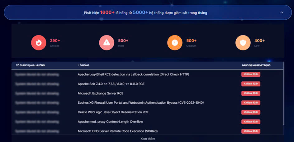 Trong tháng 12/2024, Hệ thống giám sát an toàn không gian mạng quốc gia đã ghi nhận có 784.180 điểm yếu, lỗ hổng an toàn thông tin tại các máy chủ, máy trạm, hệ thống thông tin của các cơ quan, tổ chức nhà nước; phát hiện hơn 1600 lỗ hổng trên 5000 hệ thống đang mở công khai trên internet. Hệ thống giám sát cũng đã ghi nhận 12 lỗ hổng mới được công bố, có mức độ ảnh hưởng nghiêm trọng/cao có thể bị lợi dụng để tấn công, khai thác vào các hệ thống của các cơ quan, tổ chức. Đây là các lỗ hổng tồn tại trên các sản phẩm phổ biến của nhiều cơ quan, tổ chức, doanh nghiệp.
