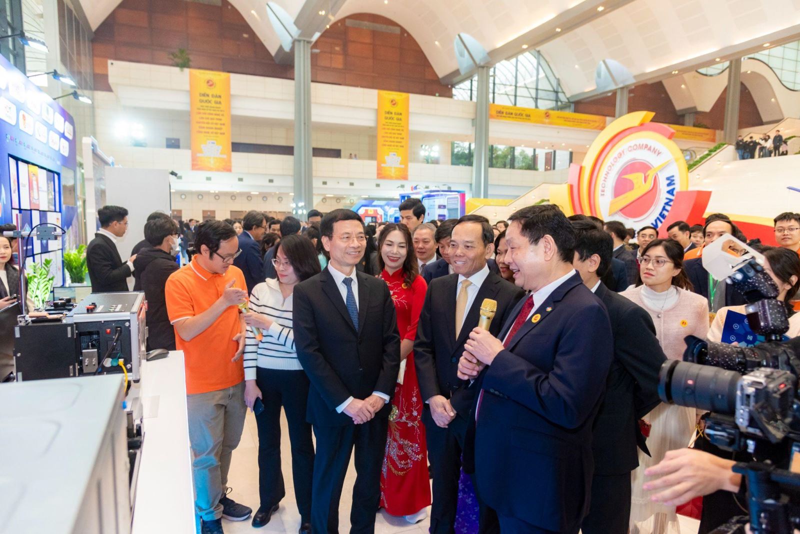 Trưởng ban Ban Chính sách, chiến lược Trung ương Trần Lưu Quang, Bộ trưởng Bộ Thông tin và Truyền Thông Nguyễn Mạnh Hùng tham quan gian hàng của Tập đoàn FPT.