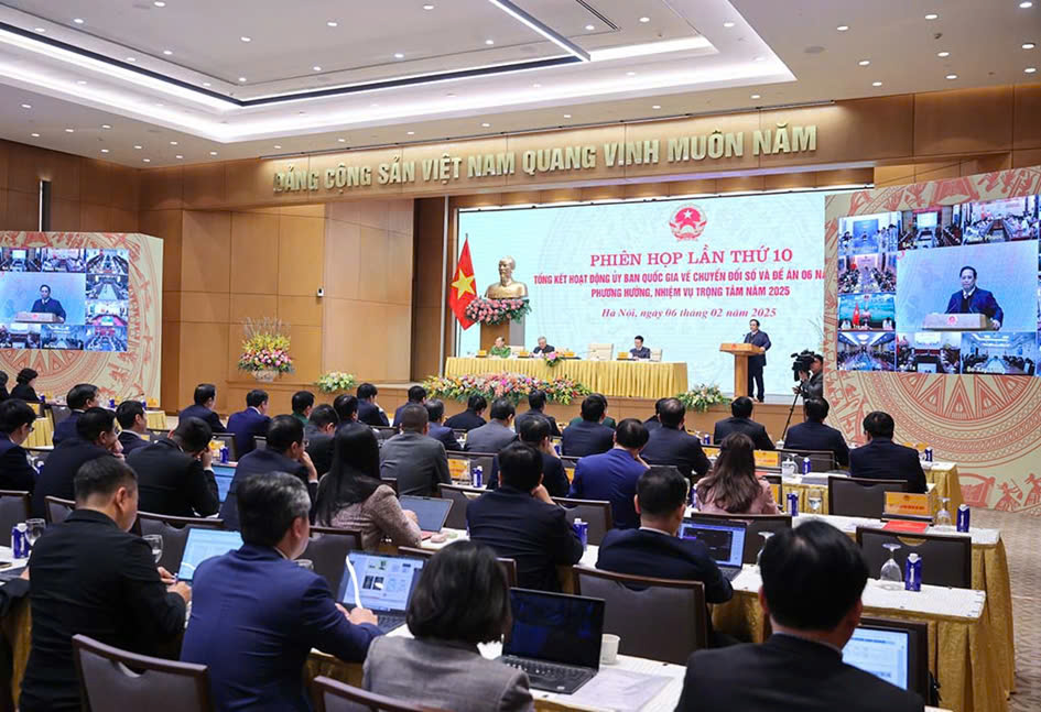 Thủ tướng Phạm Minh Chính chủ trì Phiên họp lần thứ 10 tổng kết hoạt động của Ủy ban Quốc gia về chuyển đổi số và Đề án 06 năm 2024, phương hướng, nhiệm vụ trọng tâm năm 2025 ngày 06/02/2025 (nguồn: VGP).