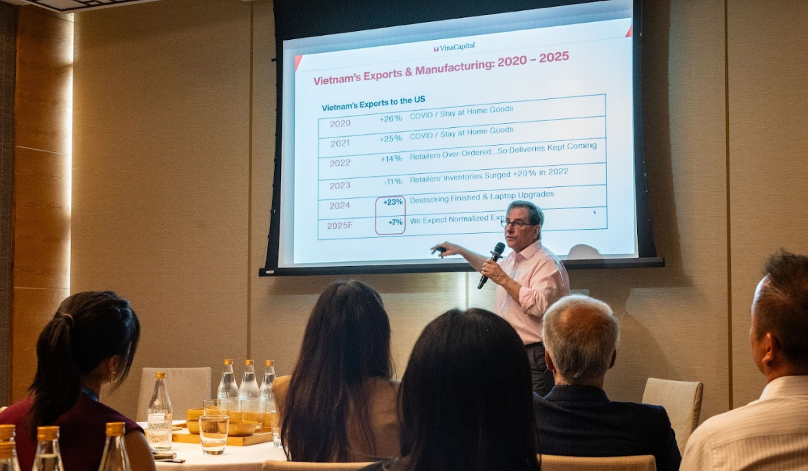 Tại Hội nghị, ông Michael Kokalari (VinaCapital) đã trình bày về triển vọng kinh tế của Việt Nam trong bối cảnh có nhiều biến động. Ông đánh giá cao lợi thế địa chính trị của Việt Nam và nhận định, Việt Nam là quốc gia duy nhất đang đi theo mô hình phát triển của các nước Đông Á như Nhật Bản, Hàn Quốc và Đài Loan (Trung Quốc). Ông Michael Kokalari cũng chỉ ra một lợi thế đặc biệt của Việt Nam so với các quốc gia đi trước: dòng vốn đầu tư trực tiếp nước ngoài (FDI) chiếm tỷ lệ cao hơn hẳn. Nếu như FDI ở các nền kinh tế Đông Á trước đây chỉ ở mức dưới 1% GDP, thì hiện tại Việt Nam, con số này dao động 6-8% GDP, tạo động lực tăng trưởng mạnh mẽ cho ngành công nghiệp xuất khẩu.