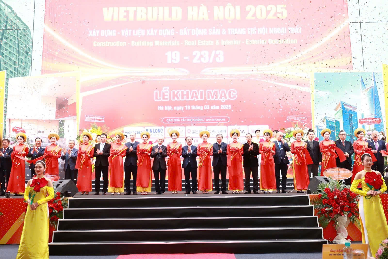 Thứ trưởng Nguyễn Văn Sinh và các đại biểu cắt băng khai mạc Triển lãm quốc tế VIETBUILD Hà Nội 2025 lần thứ nhất (nguồn: internet).