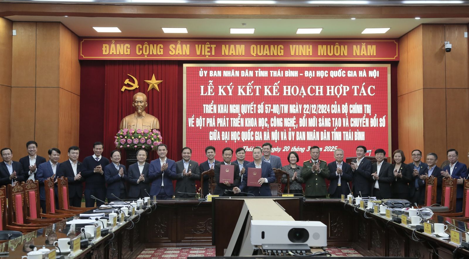 Đại học Quốc gia Hà Nội và UBND tỉnh Thái Bình vừa ký kết Kế hoạch hợp tác triển khai Nghị quyết số 57-NQ/TW ngày 22/12/2024 của Bộ Chính trị về đột phá phát triển khoa học, công nghệ, đổi mới sáng tạo và chuyển đổi số quốc gia. Kế hoạch hợp tác nhằm mục đích phát huy tiềm năng, thế mạnh của ĐHQGHN và tỉnh Thái Bình để đào tạo nguồn nhân lực, phát triển khoa học, công nghệ, đổi mới sáng tạo và chuyển đổi số phục vụ sự nghiệp phát triển kinh tế - xã hội và hội nhập quốc tế.