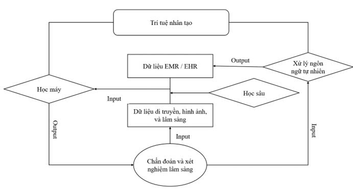 Một cách tổng hợp, mối quan hệ giữa các công nghệ AI và các dữ liệu y khoa được mô tả trong sơ đồ ở hình 1. Theo đó, các kết quả chẩn đoán và xét nghiệm lâm sàng ban đầu sẽ được máy tính ghi nhận và đọc hiểu bằng công cụ NLP. Sau khi phân tích, các kết quả ban đầu này sẽ được trả ra dưới hình thức dữ liệu EMR hoặc/và EHR. Kết hợp với việc phân tích dữ liệu di truyền, hình ảnh và lâm sàng bằng công cụ DL, kết quả chung được tổng hợp thông qua công cụ ML. Các kết quả này sẽ được trả về cho bác sỹ để gợi ý kết luận cuối cùng và gợi mở liệu trình điều trị.