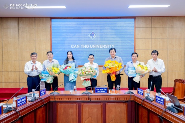PGS.TS Trần Trung Tính - Hiệu trưởng, GS.TS Trần Ngọc Hải - Phó Hiệu trưởng Trường Đại học Cần Thơ trao Quyết định và tặng hoa các nhóm nghiên cứu mới thành lập.