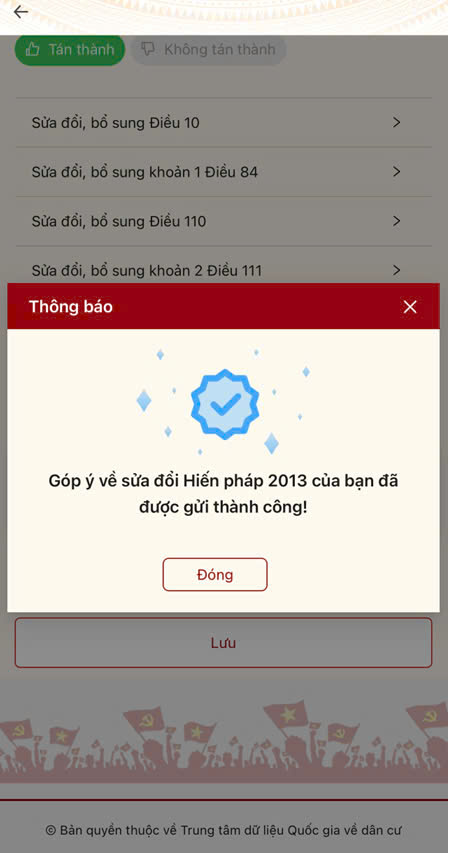 Màn hình sẽ hiện "góp ý về sửa đổi Hiến pháp 2013 của bạn đã được gửi thành công.