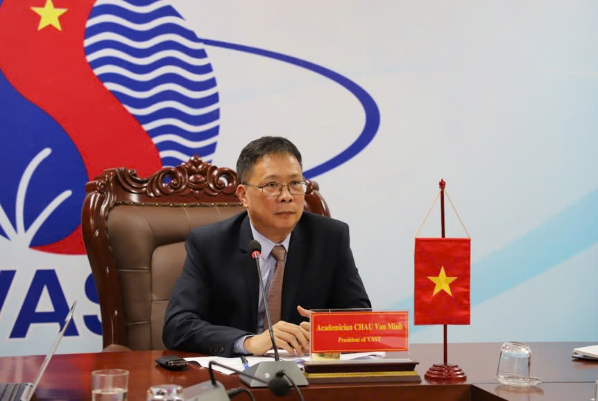 GS.VS Châu Văn Minh - Chủ tịch Viện Hàn lâm Khoa học và Công nghệ Việt Nam phát biểu khai mạc Hội thảo trực tuyến tại đầu cầu Hà Nội.