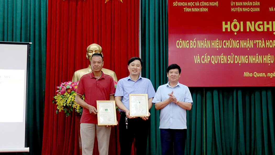 Tại Hội nghị, đại diện cơ quan quản lý nhà nước về sở hữu trí tuệ trên địa bàn tỉnh Ninh Bình đã trao Giấy chứng nhận đăng ký nhãn hiệu số 533053 “Trà hoa vàng Cúc Phương” cho UBND huyện Nho Quan làm chủ sở hữu; lãnh đạo UBND huyện Nho Quan đã trao Giấy chứng nhận quyền sử dụng nhãn hiệu chứng nhận “Trà hoa vàng Cúc Phương” cho Công ty TNHH dược liệu Vũ Gia và hộ ông Nguyễn Anh Dũng (Nho Quan).