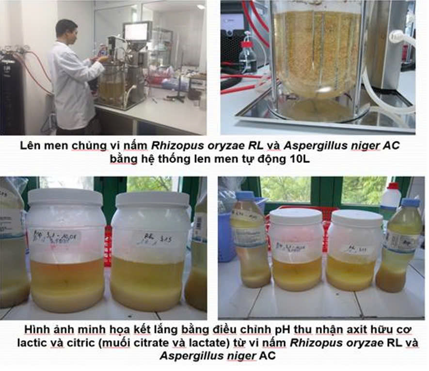 Bên cạnh đó, đề tài đã hoàn thiện quy trình sản xuất chế phẩm axít hữu cơ từ các chủng vi nấm Rhizopus oryzae RL và Aspergillus niger AC sinh axít lactic và citric quy mô thí nghiệm với các thông số tối ưu về nguồn cacbon (glucose hoặc saccharose), nguồn nitơ ((NH4)2SO4 hoặc NH4NO3), thời gian lên men (72 giờ), công nghệ thu (vải lọc 25-30 µm), kết tinh (pH 10, nhiệt độ 5-10oC, 18 giờ), sấy đông khô (-80oC, 24 giờ), phối trộn (lactate/citate 35%:35%, phụ gia canxi cacbonat đủ 100%) và bảo quản chế phẩm (bao bì ghép nhiều lớp, nhiệt độ phòng 25-27oC).