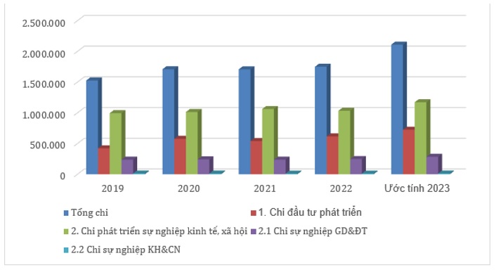 Tổng chi ngân sách cho dịch vụ xã hội biến động, từ 7.522 tỷ đồng (2019) tăng gấp đôi lên 14.812 tỷ đồng (2020) do COVID-19, giảm còn 8.078 tỷ đồng (2021), rồi phục hồi 9.473 tỷ đồng (2023). Tỷ trọng chi đầu tư phát triển tăng từ 25,71% (2019) lên trên 40% (2022-2023), trong khi chi thường xuyên giảm từ đỉnh 68,08% (2021) xuống 59,38% (2023). Chi cho giáo dục tăng từ 1.996 tỷ lên 2.485 tỷ đồng, chi cho KH&CN còn rất thấp, dưới 15 tỷ đồng.