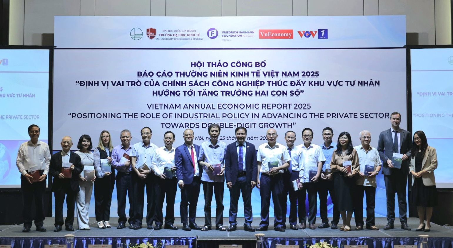 Tại Hội thảo, đại diện nhóm tác giả của BCKTTN 2025 trình bày những kết quả chính của Báo cáo, trong đó tập trung vào một số nội dung chính: Toàn cảnh kinh tế thế giới năm 2024 và gần nửa đầu năm 2025, tổng quan về một số nền kinh tế lớn và có mối quan hệ chặt chẽ với Việt Nam, triển vọng kinh tế thế giới năm 2025 những căng thẳng thương mại gần đây có tác động đến Việt Nam cũng như các quốc gia đối tác; tổng quan kinh tế Việt Nam năm 2024 và gần nửa đầu năm 2025: về tăng trưởng kinh tế như tình hình sản xuất công nghiệp, lạm phát, cung tiền tệ, tài chính, cải cách thể chế và các chính sách lớn của Đảng và Chính phủ; đồng thời phân tích thuế quan và một số rủi ro trước tình hình căng thẳng thương mại trong thời gian vừa qua; xác định động lực tăng trưởng của Việt Nam trong giai đoạn tới trên cơ sở soi chiếu mô hình tăng trưởng của Việt Nam (theo phía cung và phía cầu) với mô hình tăng trưởng kinh tế của các quốc gia Đông Á như Nhật Bản, Hàn Quốc, Đài Loan (Trung Quốc), Trung Quốc trong giai đoạn tăng trưởng cao và kinh nghiệm chính sách của các quốc gia này; phân tích chính sách công nghiệp của Việt Nam, chỉ ra những kết quả đạt được cũng như những thách thức trong thời gian qua; đồng thời đánh giá thực trạng phát triển khu vực tư nhân, từ đó đề ra các chính sách công nghiệp thúc đẩy sự phát triển của khu vực tư nhân.