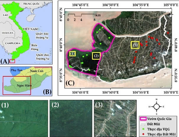 Hình 1. Khu vực nghiên cứu. (A) vị trí địa lý của khu vực; (B) khu vực nghiên cứu tại huyện Ngọc Hiển - tỉnh Cà Mau; (C) dữ liệu từ Sentinel-2 với cận cảnh các khu vực: (1) rừng ngập mặn trồng mới, (2) rừng ngập mặn tự nhiên, (3) rừng ngập mặn sản xuất kết hợp ao nuôi tôm.