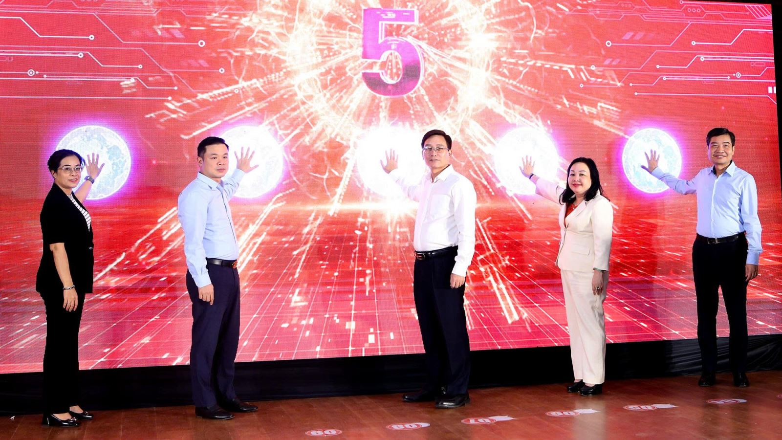 Các đại biểu thực hiện nghi thức công bố các ứng dụng số phục vụ chính quyền địa phương 2 cấp.