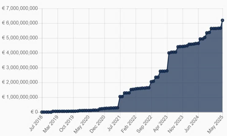 Hình 1. Tiền phạt tích lũy do vi phạm quy định bảo vệ dữ liệu chung tính đến tháng 5/2025. Nguồn: https://www.enforcementtracker.com/.