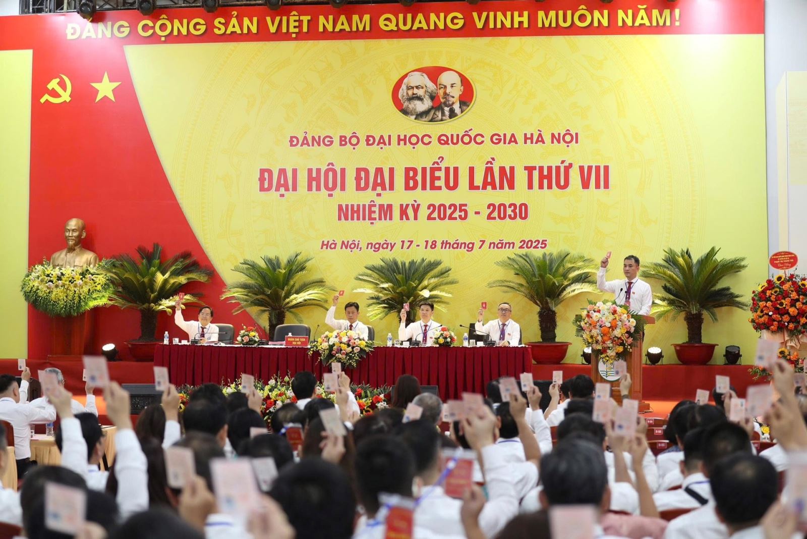 Đại hội đại biểu lần thứ VII, nhiệm kỳ 2025-2030 của Đại học Quốc gia Hà Nội tham gia biểu quyết thông qua Chương trình của Đại hội (nguồn: VNU Media).