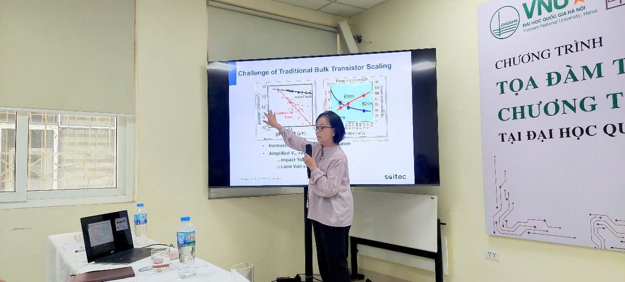 Bà Nguyễn Bích Yến cũng chia sẻ chuyên sâu về công nghệ 22 nm FDSOI - một xu hướng quan trọng trong ngành công nghiệp bán dẫn hiện đại. Bà cho biết, công nghệ này mang lại lợi thế về tiêu thụ năng lượng thấp và chi phí sản xuất hợp lý, đặc biệt phù hợp với chiến lược phát triển hệ thống tích hợp cho các thiết bị biên (edge devices) - một trong những định hướng ưu tiên của nhiều quốc gia, trong đó có Việt Nam.