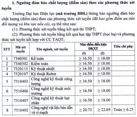Trường Đại học Điện lực (mã Trường DDL) thông báo ngưỡng đảm bảo chất lượng (điểm sàn) theo các phương thức xét tuyển (đã bao gồm điểm ưu tiên đối tượng và khu vực nếu có). Cụ thể: Phương thức xét tuyển bằng kết quả thi trung học phổ thông; phương thức xét tuyển bằng kết quả học tập trung học phổ thông (học bạ) và phương thức xét tuyển kết hợp với chứng chỉ tiếng Anh quốc tế.