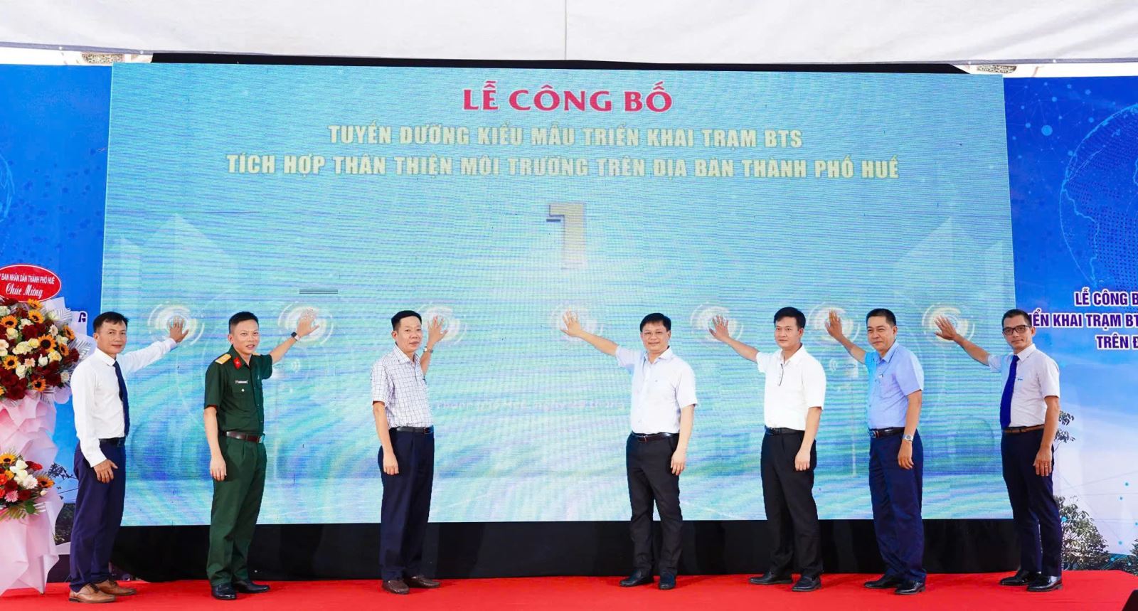 Các đại biểu thực hiện nghi thức công bố tuyến đường kiểu mẫu triển khai trạm BTS tích hợp thân thiện môi trường trên địa bàn TP Huế.