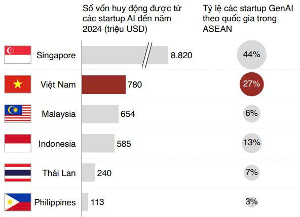 Quy mô vốn đầu tư và tỷ trọng startup GenAI trong khu vực ASEAN đến năm 2024 (nguồn: Trung tâm Đổi mới sáng tạo Quốc gia (NIC)).