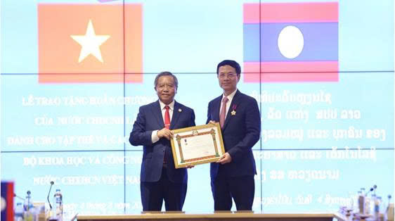 Bộ trưởng Bộ Công nghệ và Truyền thông Lào Boviengkham Vongdara đại diện Chính phủ nước CHDCND Lào trao Huân chương Lao động hạng Nhất cho Bộ trưởng Bộ Khoa học và Công nghệ Nguyễn Mạnh Hùng.