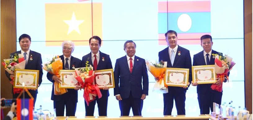 Phó Giám đốc Học viện Chiến lược Khoa học và Công nghệ Trần Minh Tân (nguyên Giám đốc Trung tâm Internet Việt Nam, thứ 3 từ trái qua) nhận Huân chương Hữu nghị của nước CHDCND Lào.