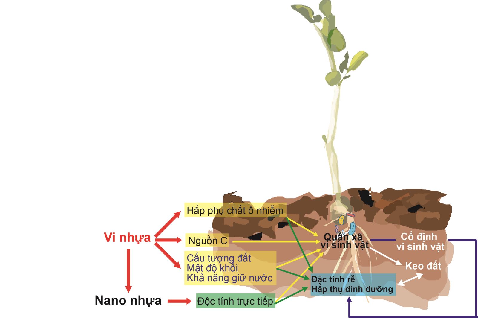 Ảnh hưởng đến quần xã sinh vật, vi sinh vật cộng sinh ở rễ: sinh trưởng và phát triển của cây trồng phụ thuộc rất nhiều vào quần xã vi sinh vật trong đất, điển hình như các nhóm vi sinh vật cộng sinh ở vùng rễ, vi khuẩn gây bệnh và nấm rễ. Nếu các dạng vi nhựa gây ra những thay đổi trong cấu trúc đất, điều này có thể ảnh hưởng tới hoạt động sống của quần xã các sinh vật trong đất [11] cũng như ảnh hưởng tới tỷ lệ khoáng hóa và các nhóm vi sinh vật định cư ở rễ (hình 1). Tương tự, các dạng nano nhựa cũng được giả thuyết có thể gây ảnh hưởng tiêu cực đến một số nhóm nấm rễ như những vật liệu nano khác. Tuy nhiên, tác động của vi nhựa hay nano nhựa đối với quần xã vi sinh vật đất, vi sinh vật định cư ở rễ vẫn chưa được chứng minh rõ ràng, cần tiếp tục nghiên cứu để làm rõ cơ chế tác động.