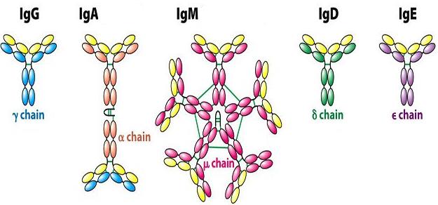 Hình 1. Có 5 loại kháng thể trong máu (huyết thanh) và cấu tạo của chúng.