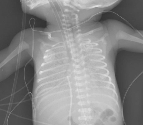 Hình ảnh X-quang ngực thẳng của một em bé sinh non bị RDS.