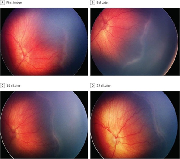 Hình ảnh võng mạc bé 22 ngày tuổi mắc bệnh ROP