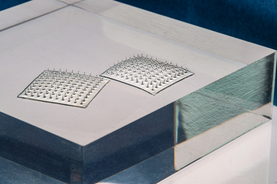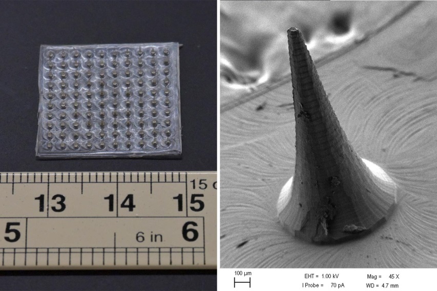 Hình 1. Bên trái là một ví dụ về mảng microneedle có 100 mũi kim. Bên phải là hình ảnh SEM của một kim đơn.