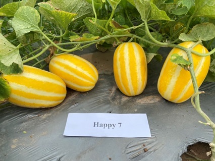 Giống dưa lê Happy 7 có thời gian sinh trưởng 70-80 ngày, thời gian từ lúc trồng đến thu quả lần đầu khoảng 63-65 ngày. Mỗi cây cho 5-7 quả khi trồng ngoài đồng ruộng và 3-4 quả trồng theo hướng ứng dụng công nghệ cao, khối lượng quả đạt trung bình 500-600 g, quả chín có vỏ màu vàng đậm sọc trắng, hình ô van, độ Brix 14-15%, chất lượng thơm ngon, giòn, ngọt.