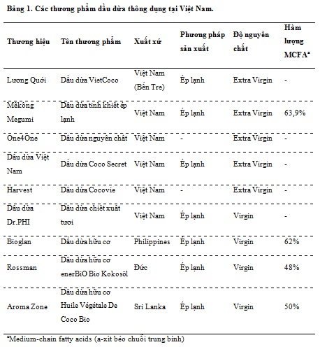 Dầu dừa ngày nay đã và đang được quan tâm, nghiên cứu rộng rãi trong y sinh học, có khả năng điều trị hoặc hỗ trợ điều trị rất nhiều bệnh lý, từ ngoài da cho đến bệnh lý mạn tính, thậm chí là các bệnh truyền nhiễm nguy hiểm. Về mặt hóa học, dầu dừa là một loại dầu giàu chất béo bão hòa, hay còn gọi là chất béo no. Cụ thể, thành phần của dầu dừa chứa tới 90-92% a-xít béo bão hòa và khoảng 8-10% a-xít béo không bão hòa, tồn tại dưới dạng triglycerides. Đặc biệt, phần lớn các a-xit béo bão hòa trong dầu dừa có chiều dài chuỗi carbon từ 6-12 carbon (tức là chuỗi dài trung bình). Trong đó, a-xít béo lauric (C12: 0) là loại chiếm ưu thế nhất (>45%). Đây cũng là một a-xít béo quan trọng nhất (có trong sữa mẹ), sở hữu nhiều tác dụng sinh học và trị liệu. Mặc khác, dầu dừa chứa một tỷ lệ cao triglycerides chuỗi trung bình, một loại chất béo tự nhiên dễ thủy phân và tiêu hóa trong đường ruột. Ngoài các thành phần chất béo, dầu dừa tự nhiên còn chứa nhiều thành phần khác như: hoạt chất dạng sterols (bao gồm các phytosterols); các hoạt chất dạng tocopherols; các khoáng tố: calcium, potassium, sodium, phosphorus, đồng, sắt. Đặc biệt, a-xít béo lauric trong dầu dừa được dùng nhiều trong thẩm mỹ, ẩm thực, thuốc và là nguồn nguyên liệu tổng hợp nên hoạt chất monolaurin, một chất chuyển hóa có hoạt tính sinh học mạnh. Các chế phẩm trên thị trường rất phong phú, được điểm qua trong bảng 2.