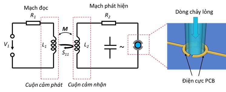 Để có thể phát hiện được sự thay đổi về tính chất điện của dòng chảy lỏng, cấu trúc đề xuất của nhóm nghiên cứu sử dụng kỹ thuật phát hiện tần số cộng hưởng của khung cộng hưởng LC được hình thành từ mạch phát hiện, bao gồm cuộn cảm nhận tín hiệu và cấu trúc điện cực cảm biến (hình 1). Sự thay đổi về tính chất điện của dung dịch trong dòng chảy hoặc sự xuất hiện của vật thể lạ với tính chất điện khác biệt sẽ làm thay đổi tham số điện của cặp điện cực cảm biến, dẫn tới sự thay đổi về tần số cộng hưởng của khung cộng hưởng LC của mạch phát hiện. Việc phát hiện sự thay đổi tần số cộng hưởng này được thực hiện thông qua đánh giá giá trị hệ số phản hồi S11 bằng cách sử dụng một thiết bị phân tích mạng (Network analyzer).