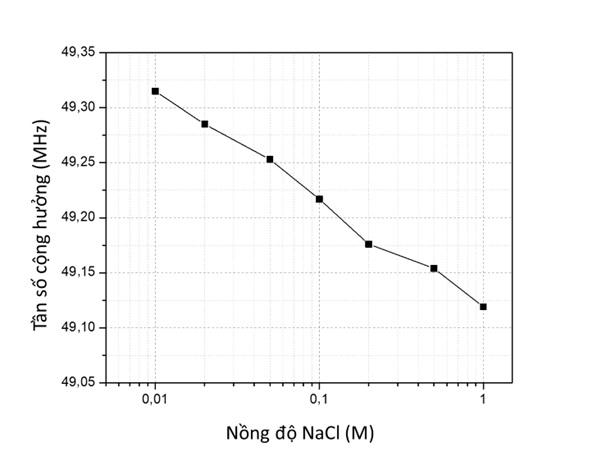 Để đánh giá hiệu quả của phương pháp đề xuất trong việc phát hiện độ dẫn dòng chảy lỏng cũng như phát hiện các vật thể lạ trong dòng chảy, nhóm nghiên cứu đã sử dụng dung dịch NaCl với các nồng độ khác nhau, tương ứng với các độ dẫn khác nhau của dung dịch và sử dụng các bọt khí tương ứng với các đối tượng lạ trong dòng chảy. Kết quả thử nghiệm cho thấy, sự phụ thuộc của tần số cộng hưởng của khung cộng hưởng cảm biến LC vào nồng độ của dung dịch NaCl được lấp đầy trong kênh dẫn (hình 2).