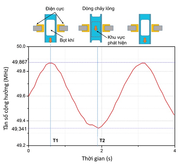 Dựa trên việc đánh giá tần số cộng hưởng này, sự thay đổi về độ dẫn của dung dịch trong dòng chảy hoàn toàn có thể được phát hiện bằng cách sử dụng cấu trúc cảm biến không dây đề xuất. Ngoài ra, sự xuất hiện của vật thể lạ, ví dụ như bọt khí, trong dòng chảy cũng có thể được phát hiện dựa trên việc phân tích tần số cộng hưởng ghi nhận được theo thời gian (hình 3).
