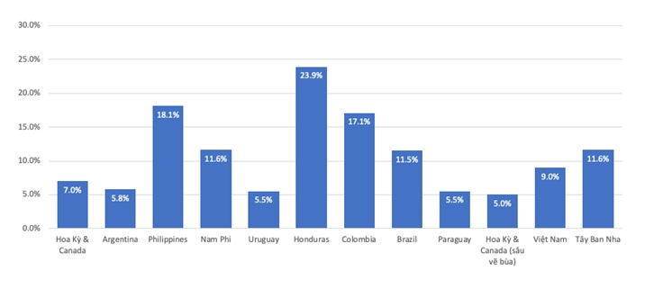 Mức tăng năng suất trung bình khi trồng ngô BĐG tại các nước từ năm 1996-2020 (đơn vị: %).