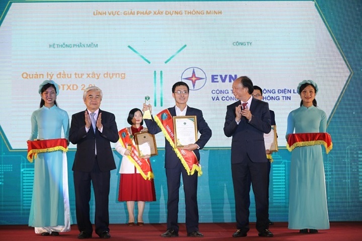 Đại diện EVNICT nhận giải thưởng ở hạng mục Giải pháp xây dựng thông minh năm 2022.